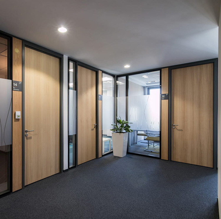5) Contrôle acoustique supérieur: les cloisons peuvent être conçues pour une excellente étanchéité acoustique, en utilisant du verre stratifié, du double vitrage, des noyaux isolants et des joints acoustiques pour atteindre un STC élevé.